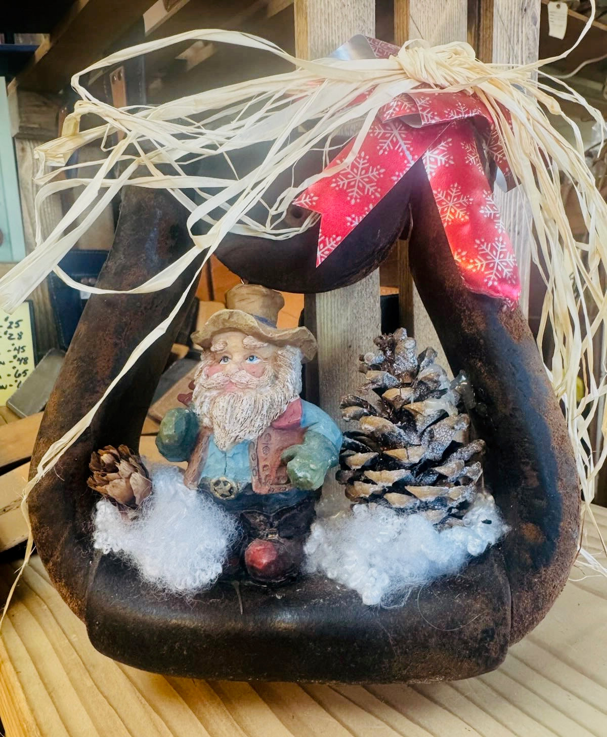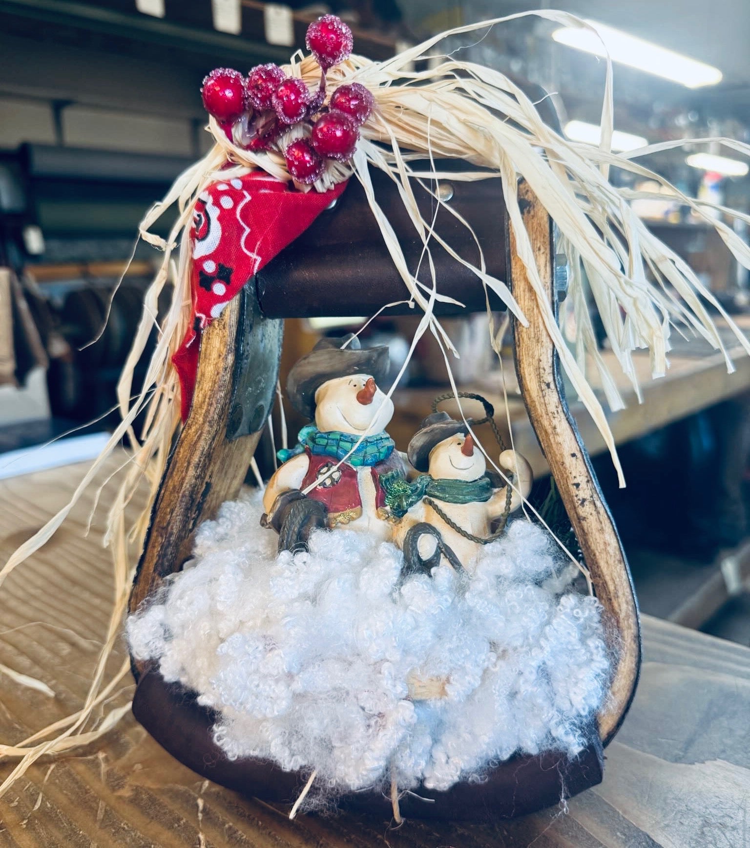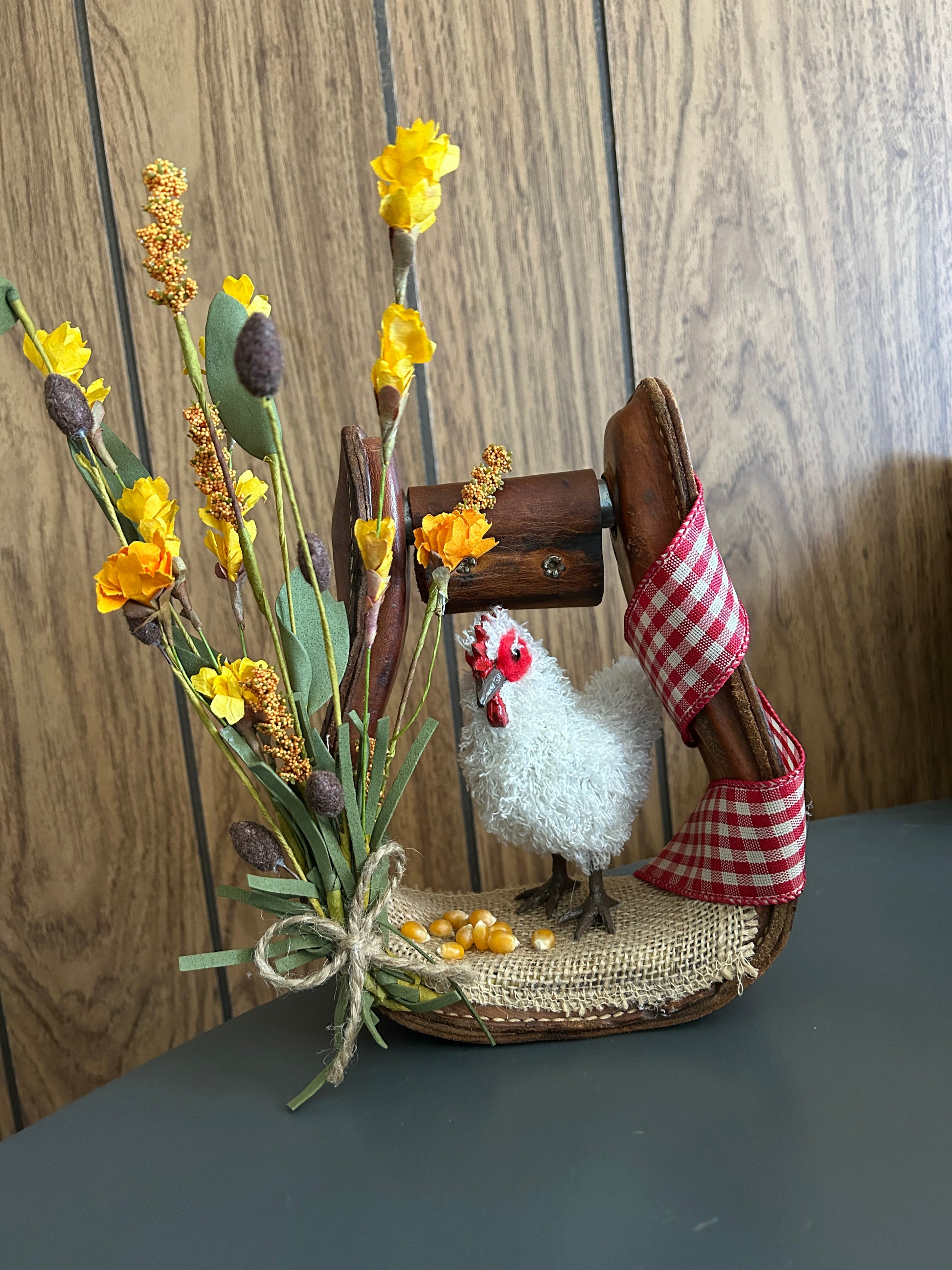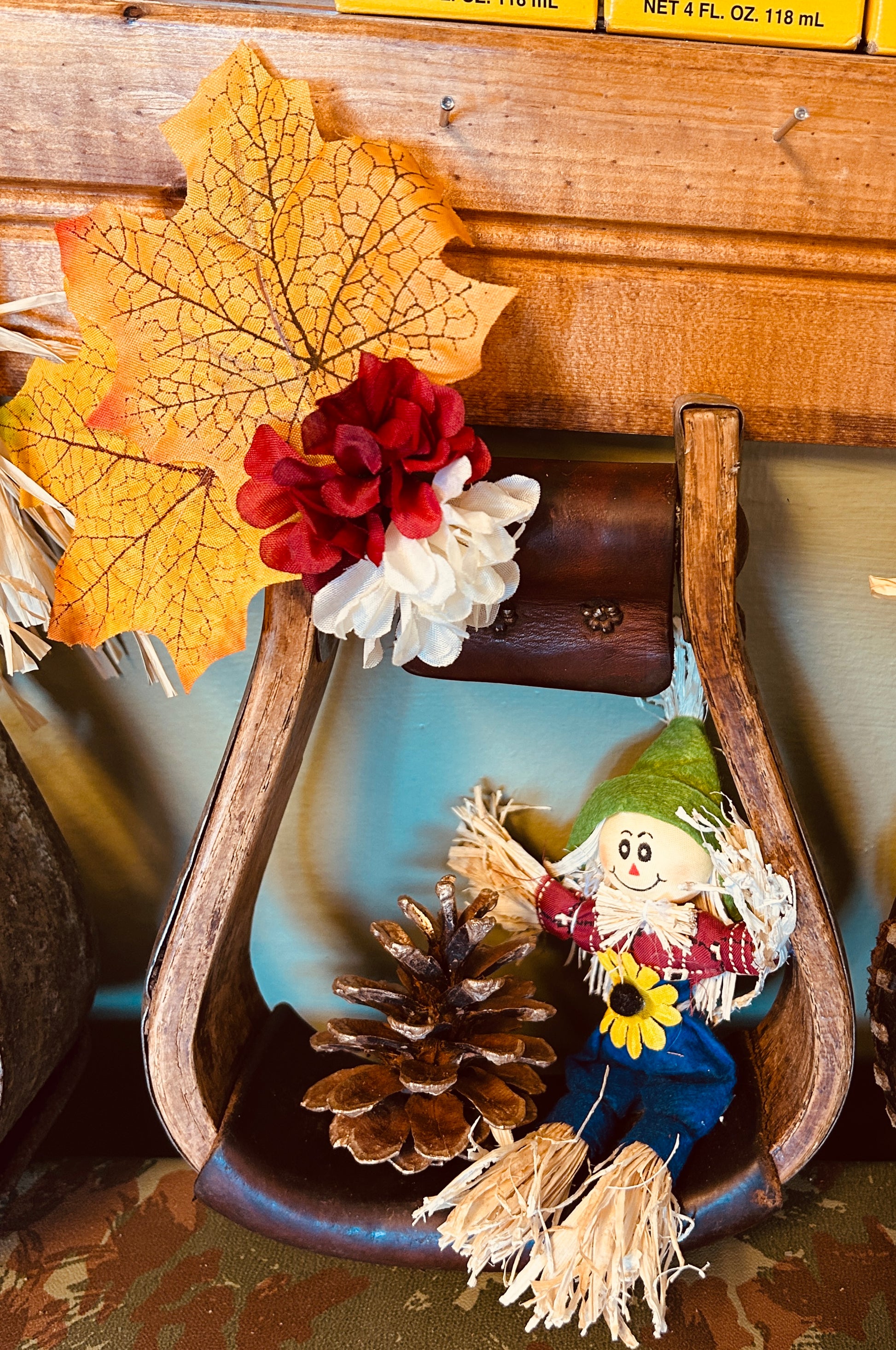 Inspired by my grandma, who had a gift for turning worn and weathered things into keepsakes, these decorations blend rustic heritage with a touch of seasonal cheer. From fall florals and farm animals to Christmas pine and ribbon accents, every stirrup tells its own story.